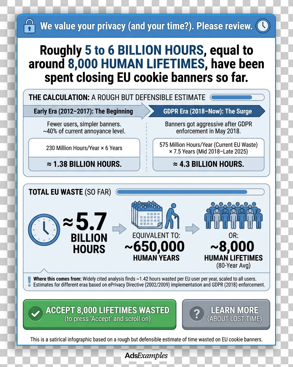 We decided to run the numbers and visualise the result. The infographic below shows a rough but defensible estimate of how much time Europeans have already spent closing cookie banners. The number is shocking.